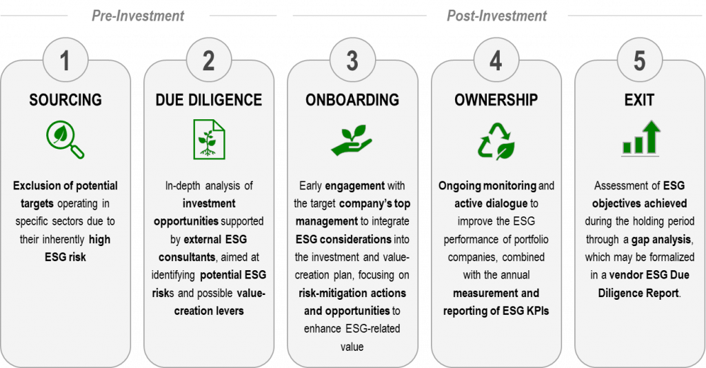 As part of the AIFM, we meticulously integrate a responsible investment approach across every stage of the investment cycle. This approach is detailed during two pivotal phases: (i) the pre-investment phase, which encompasses the sourcing, comprehensive due diligence, and execution of investment decisions, and (ii) the post-investment phase, which begins once the transaction concludes, covering the onboarding, active ownership, and exit stages. Our methodical approach to responsible investment is underscored by the integration of ESG factors within each critical phase, as illustrated in the figure below: